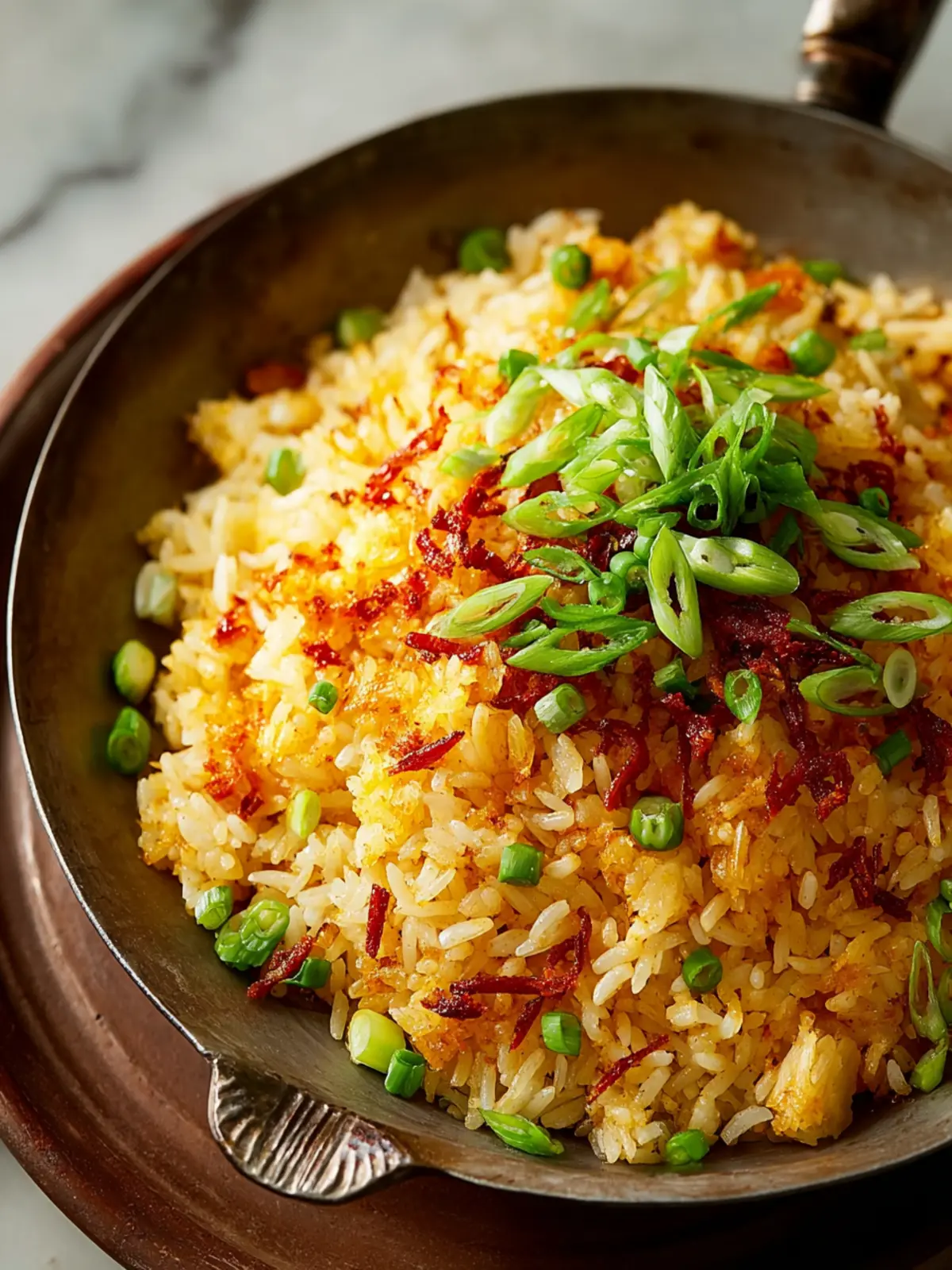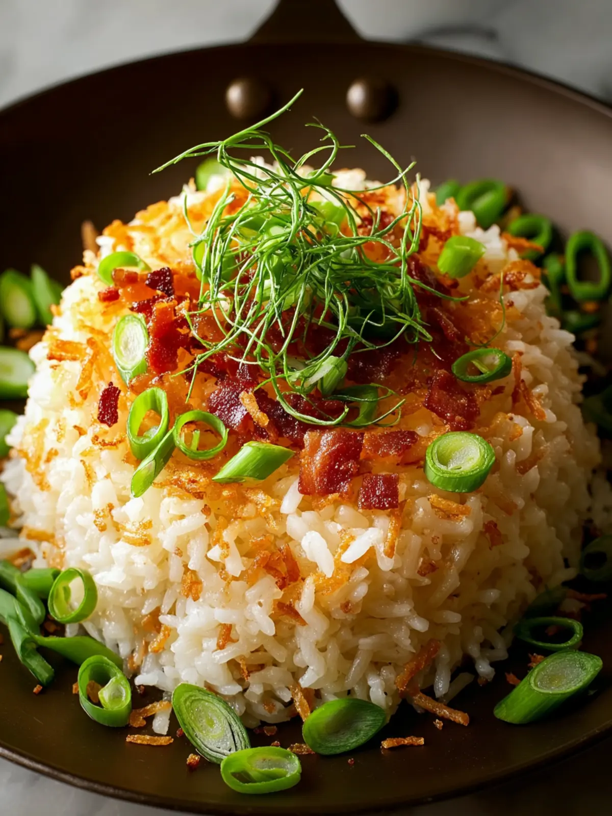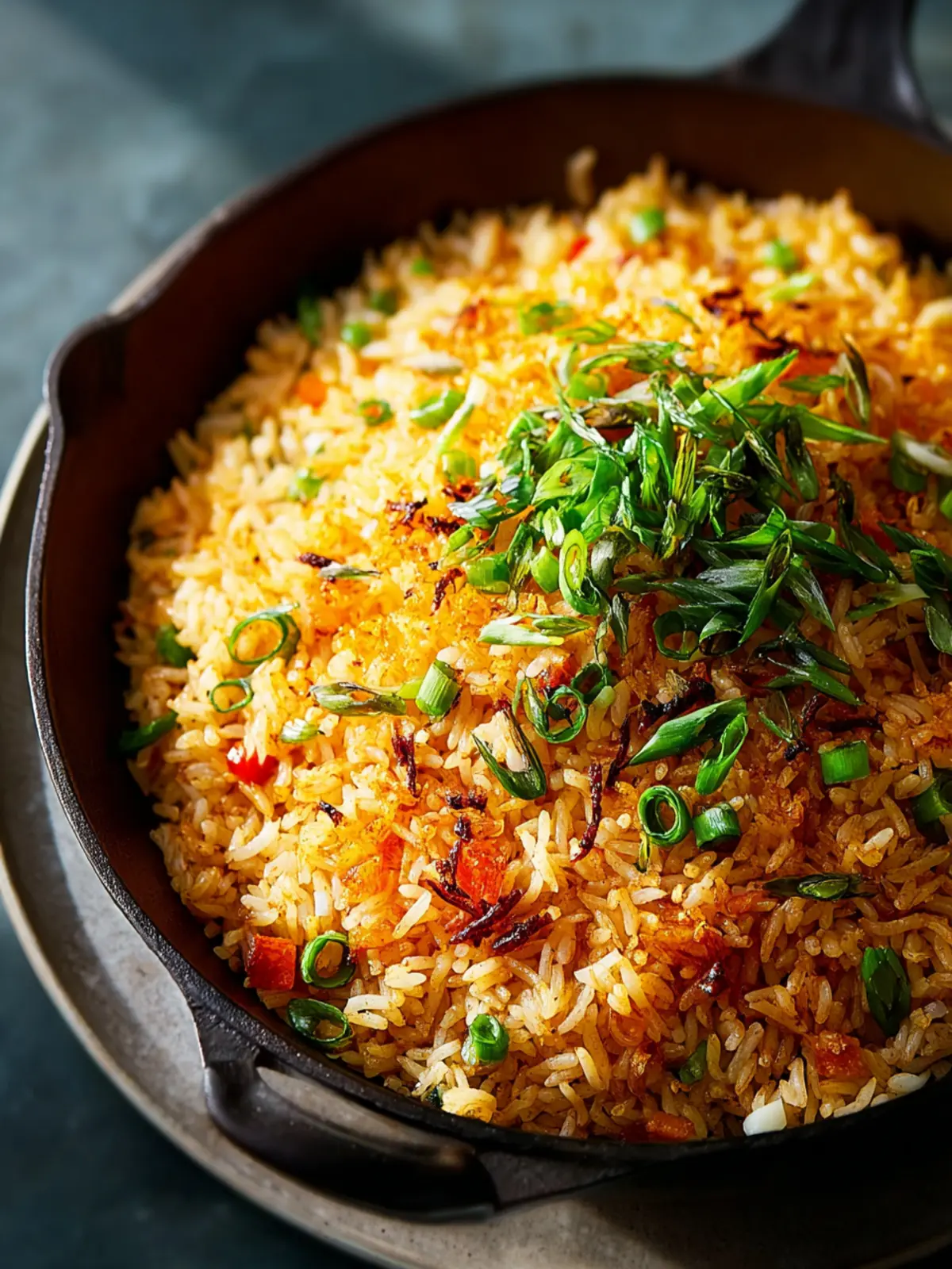 - Once done, transfer the rice to a serving platter, garnish with additional scallions, and enjoy.