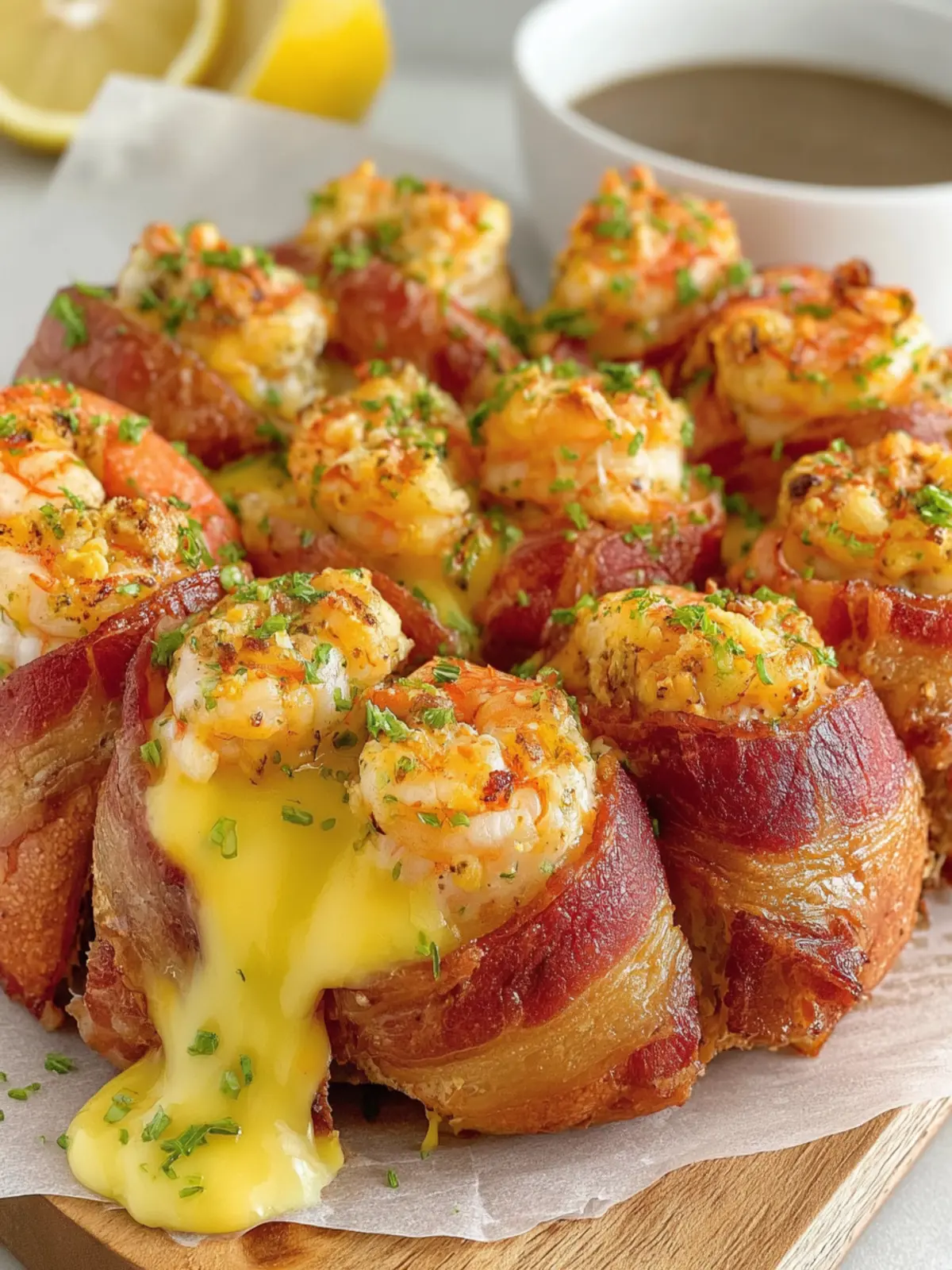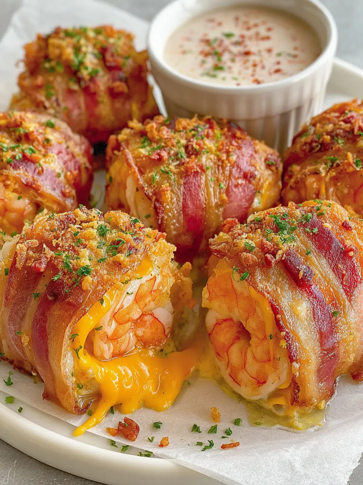Delicious shrimp wrapped in bacon and cheese, baked to crispy perfection.