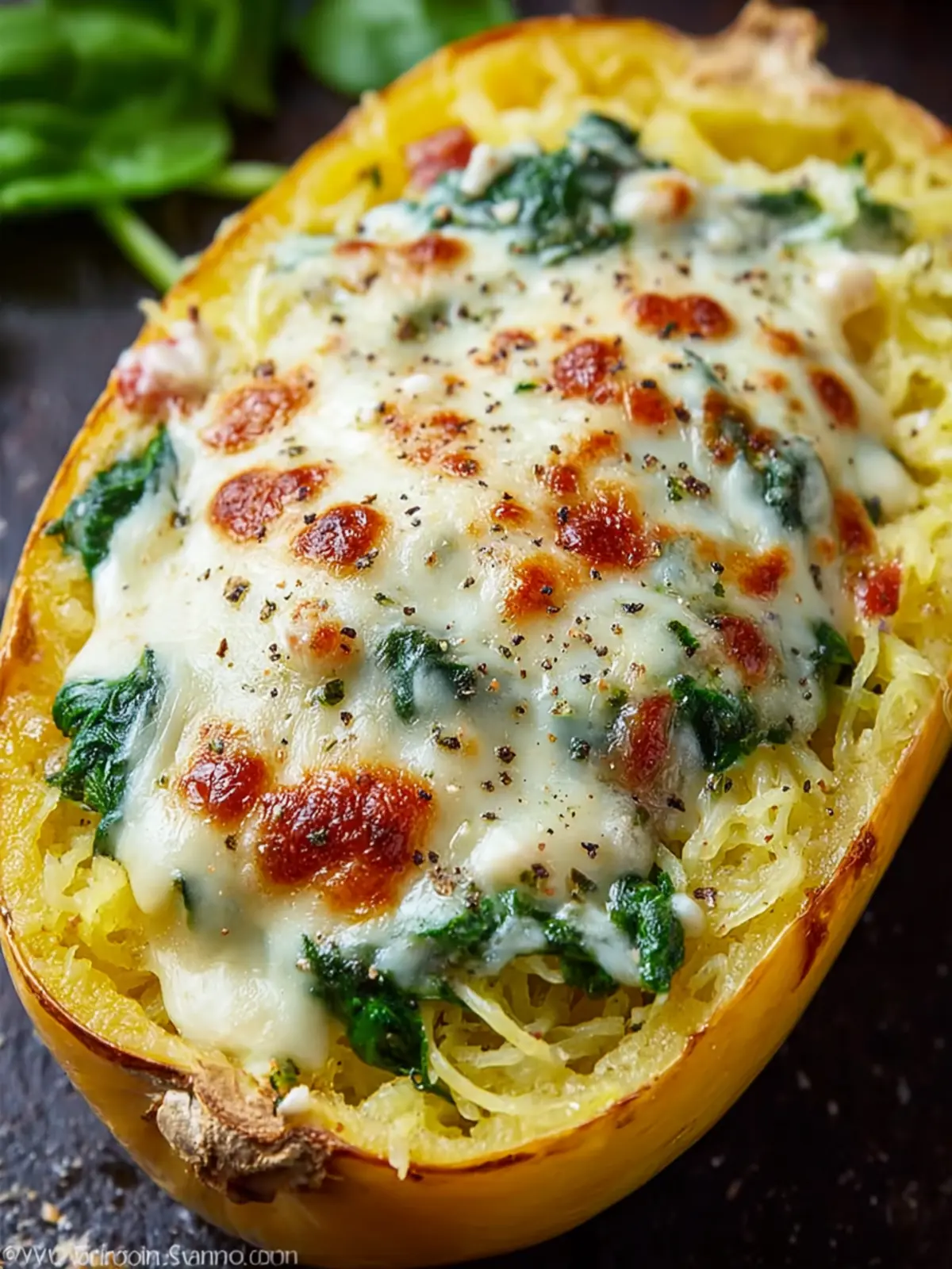 This creamy spinach and cheese stuffed spaghetti squash is a delicious and healthy option for dinner, packed with flavors and textures.
