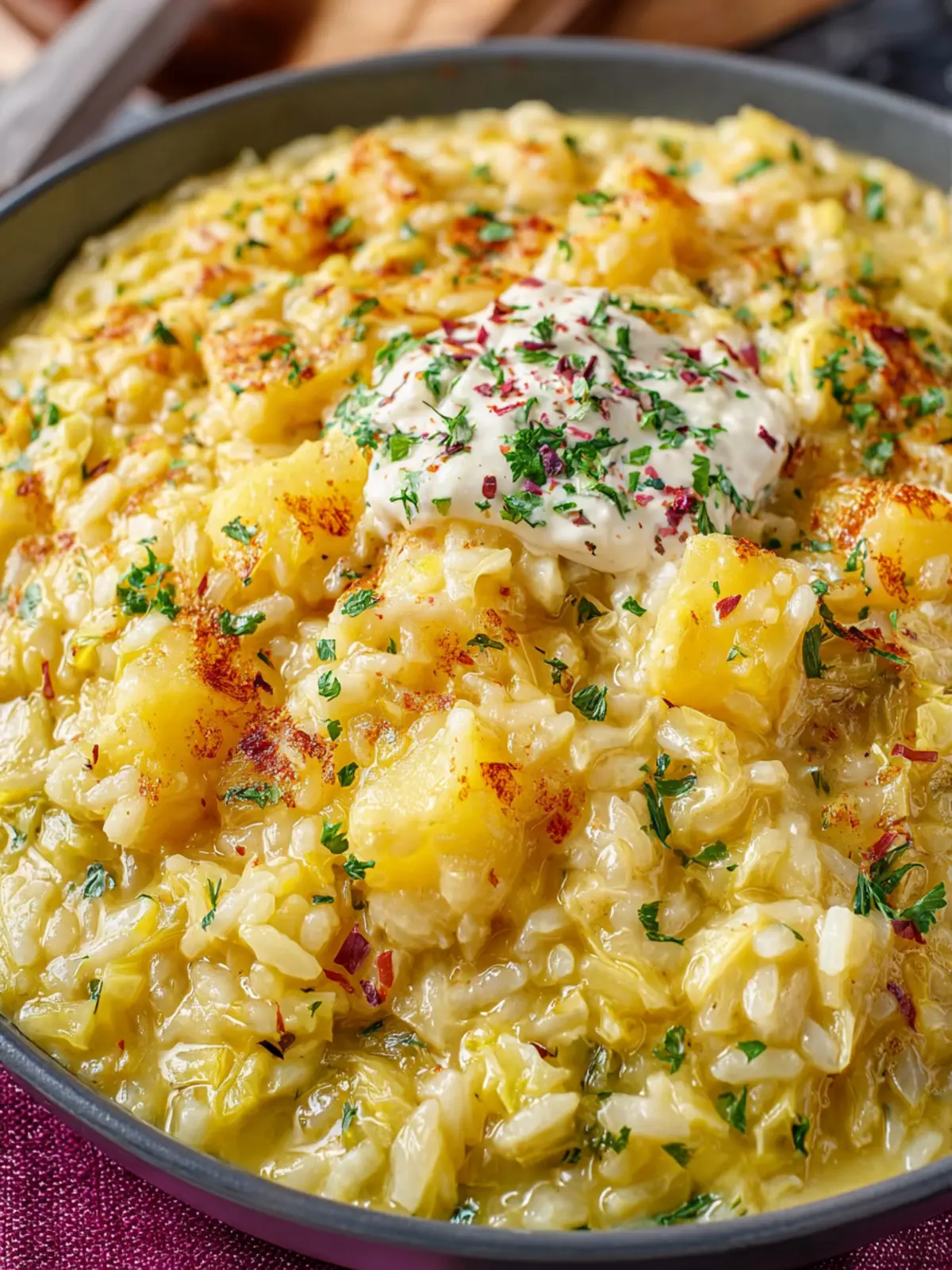 A delicious creamy risotto made with green cabbage, risotto rice, and Swiss cheese.