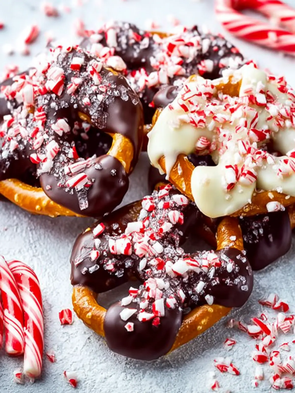 Crushed Peppermint Candy Canes: These serve not just as a delightful garnish but also elevate the visual appeal. The bright red and white bits bring a festive touch and a satisfying crunch atop each pretzel.