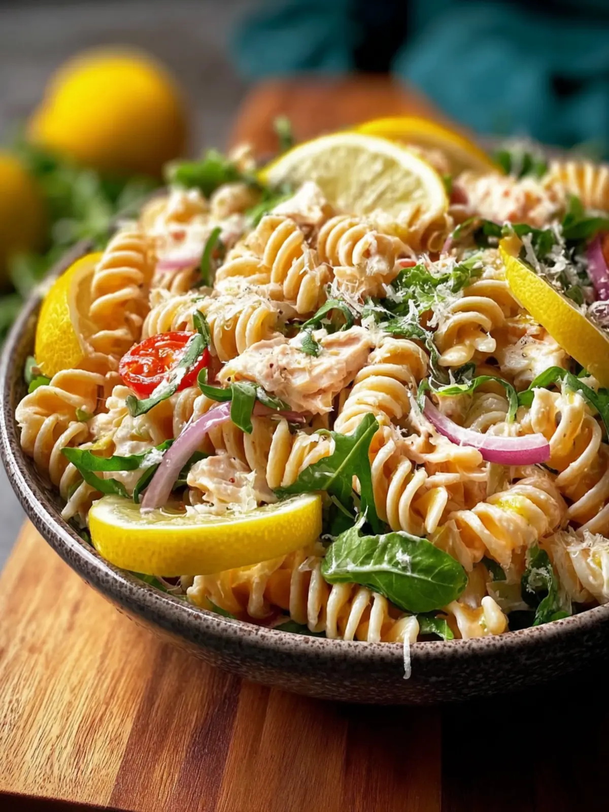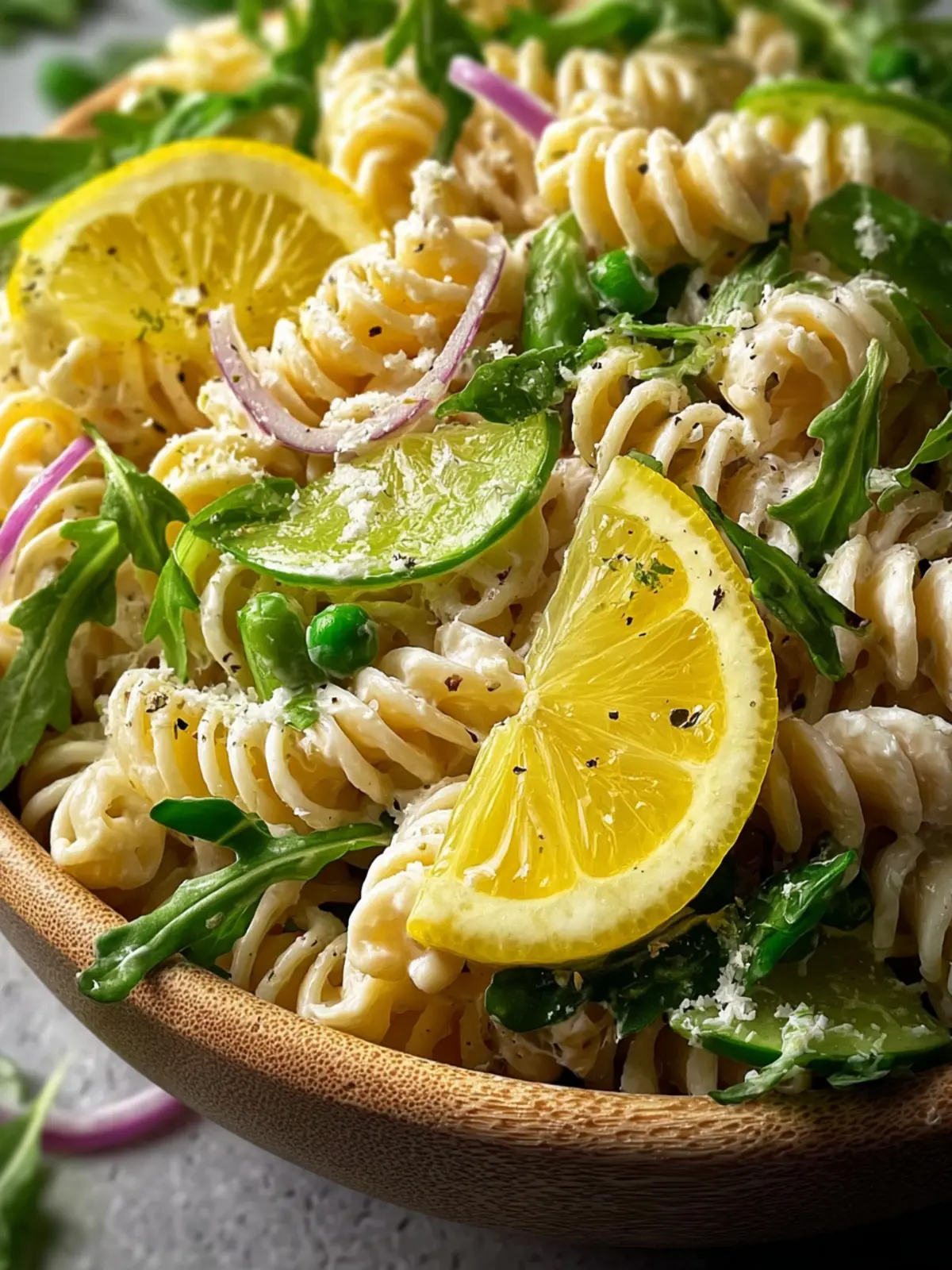 This refreshing rotini pasta salad combines tender pasta with shredded chicken, arugula, and a creamy lemon dressing for a delightful dish.