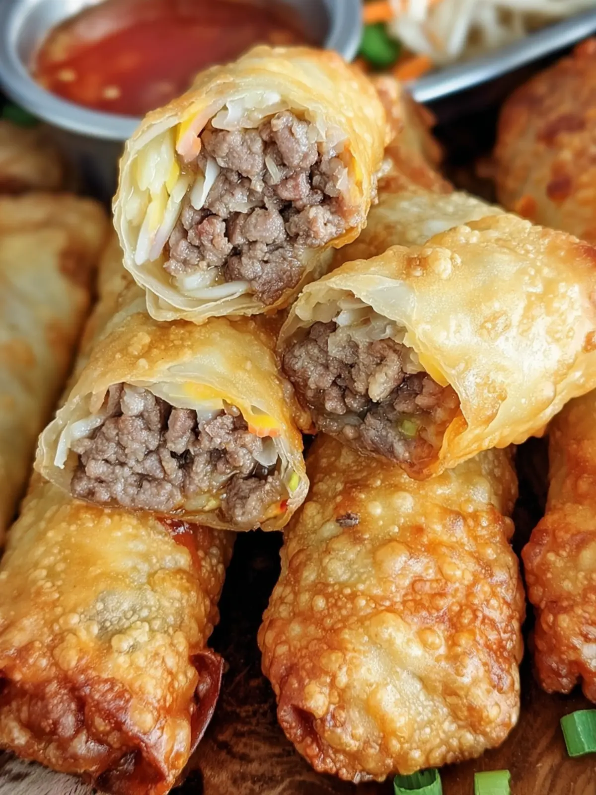 Delicious crispy beef egg rolls filled with a savory mixture of ground beef and vegetables.
