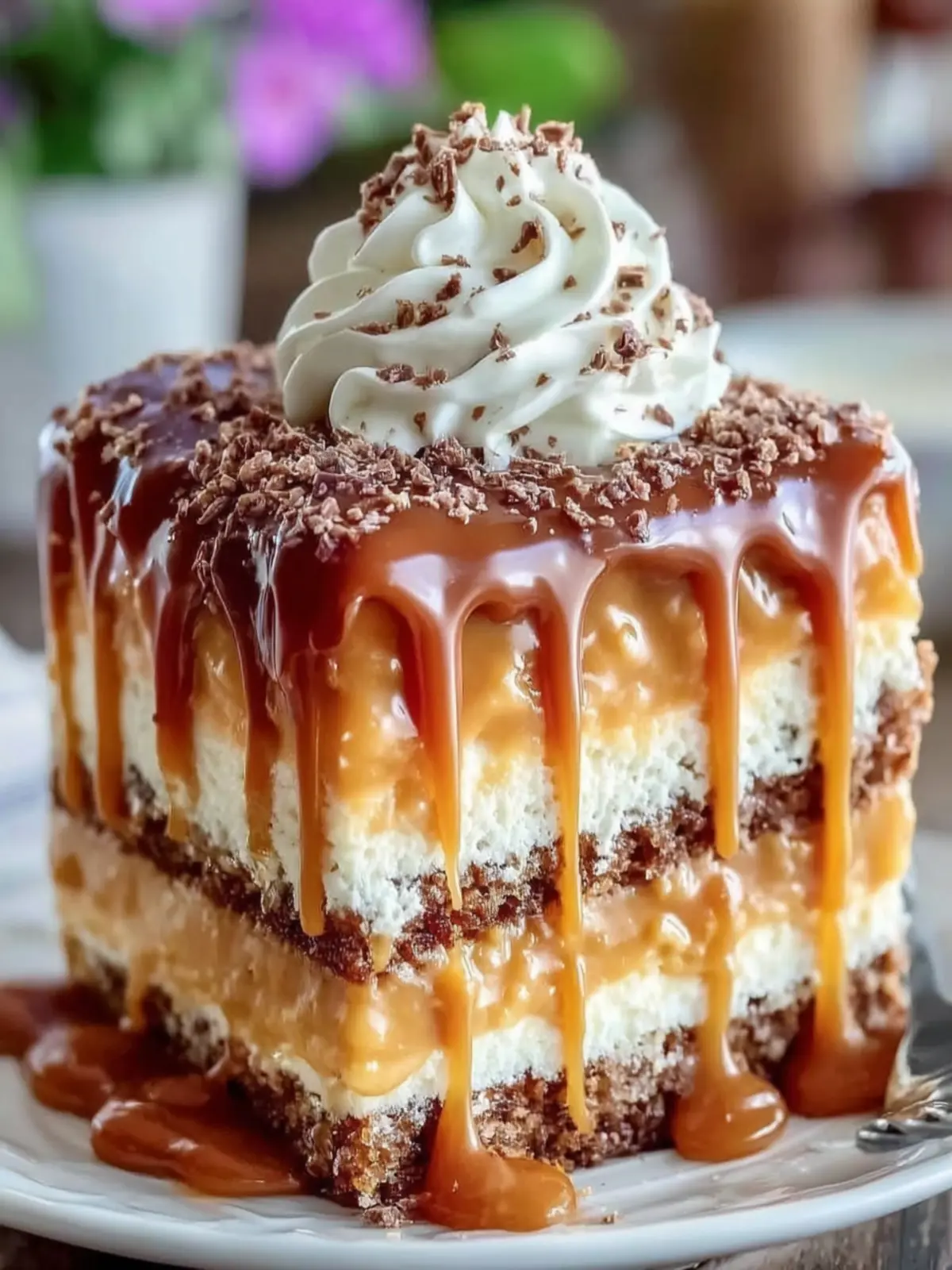 - Top and Drizzle: Pour caramel sauce over the assembled cake, allowing it to drizzle down the sides.