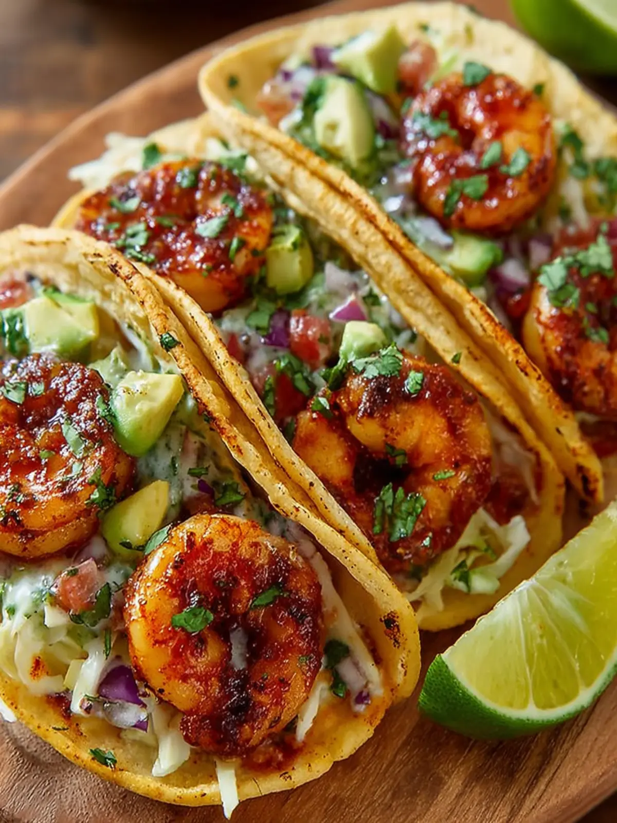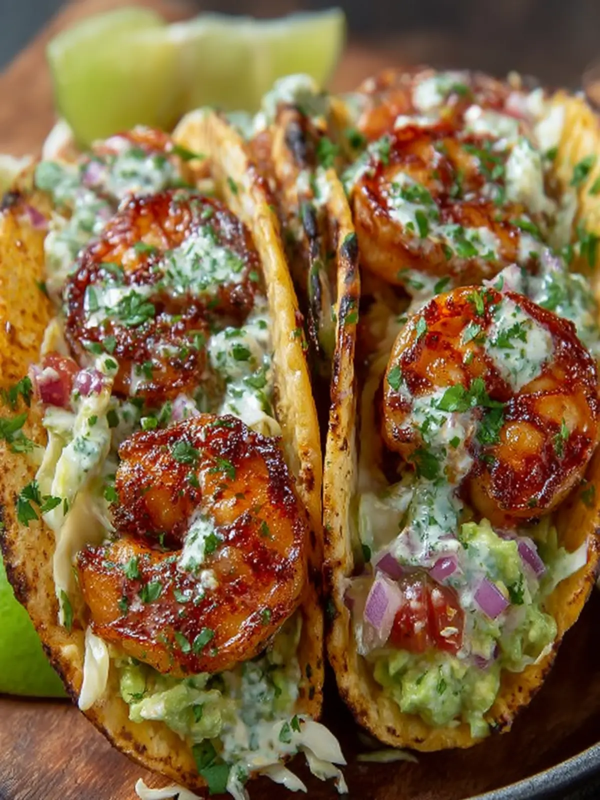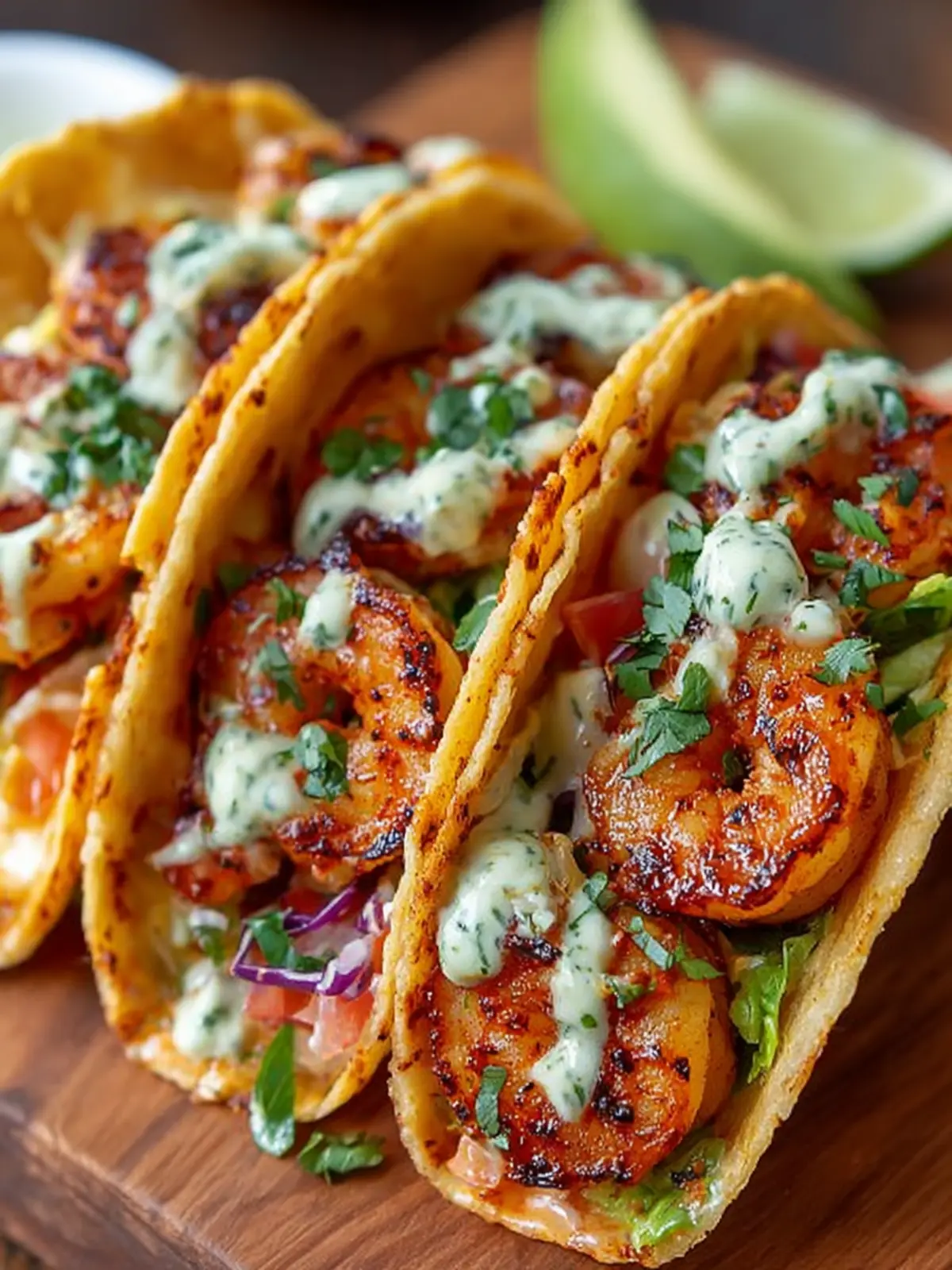- Assemble the Tacos: Place a layer of shredded cabbage on each tortilla. Top with grilled shrimp, drizzle with the creamy sauce, and sprinkle with chopped cilantro. Serve with lime wedges on the side.