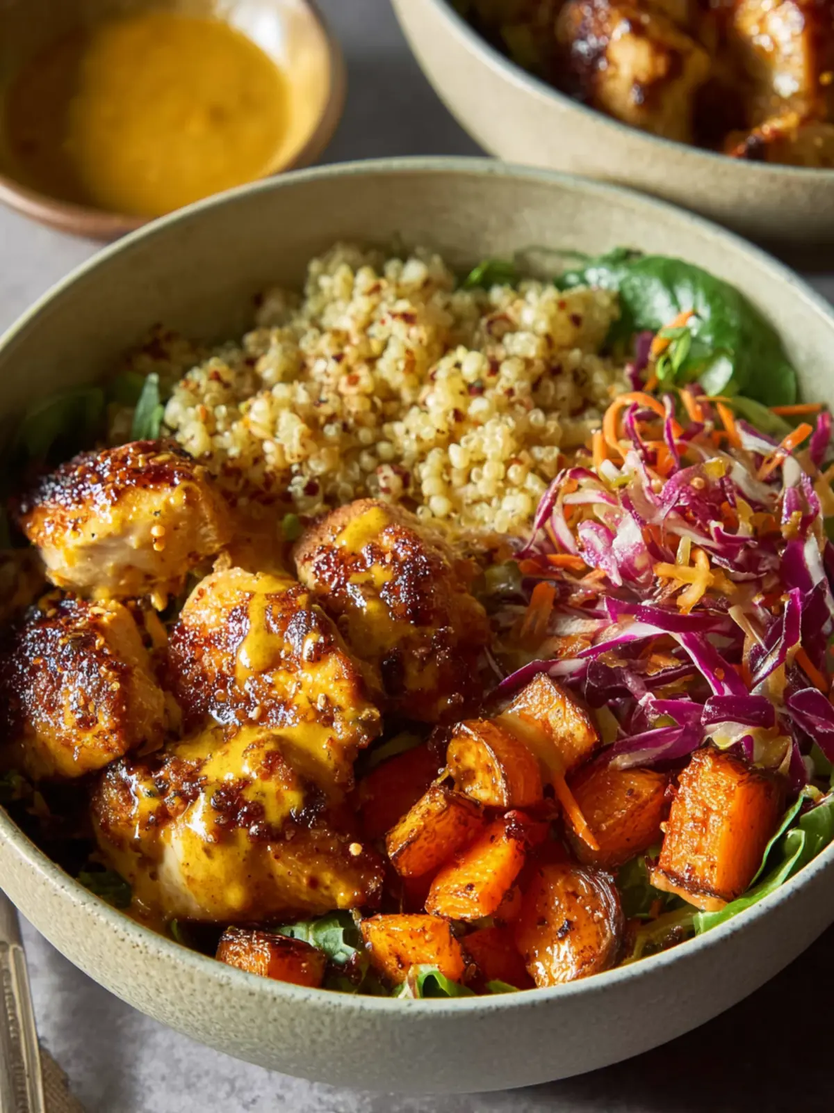 A delicious and healthy meal featuring roasted chicken thighs, sweet potatoes, and a fresh purple cabbage coleslaw, served over quinoa and drizzled with a spicy honey mustard sauce.