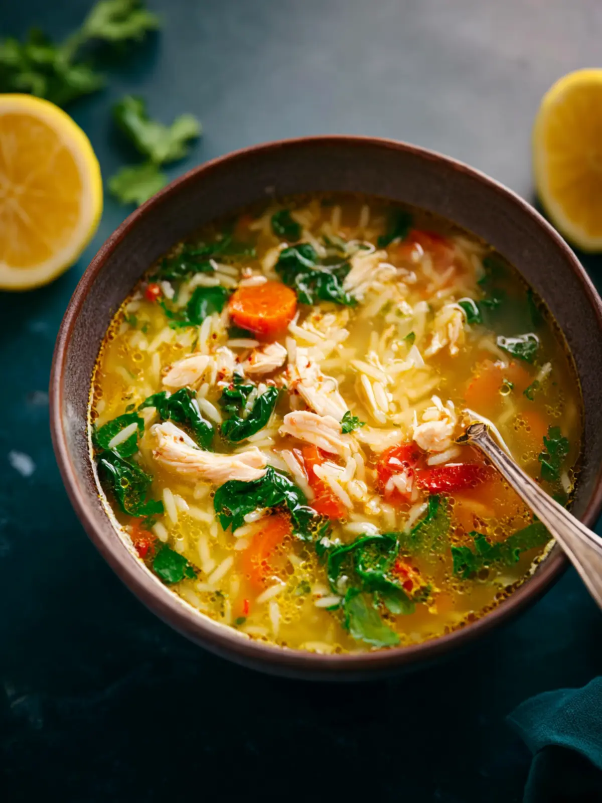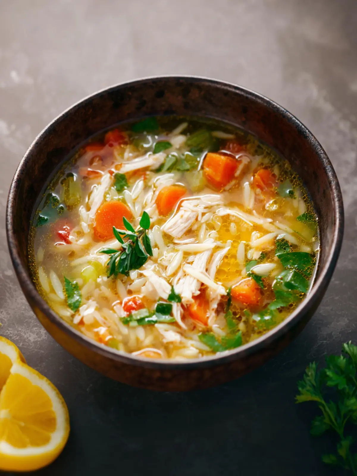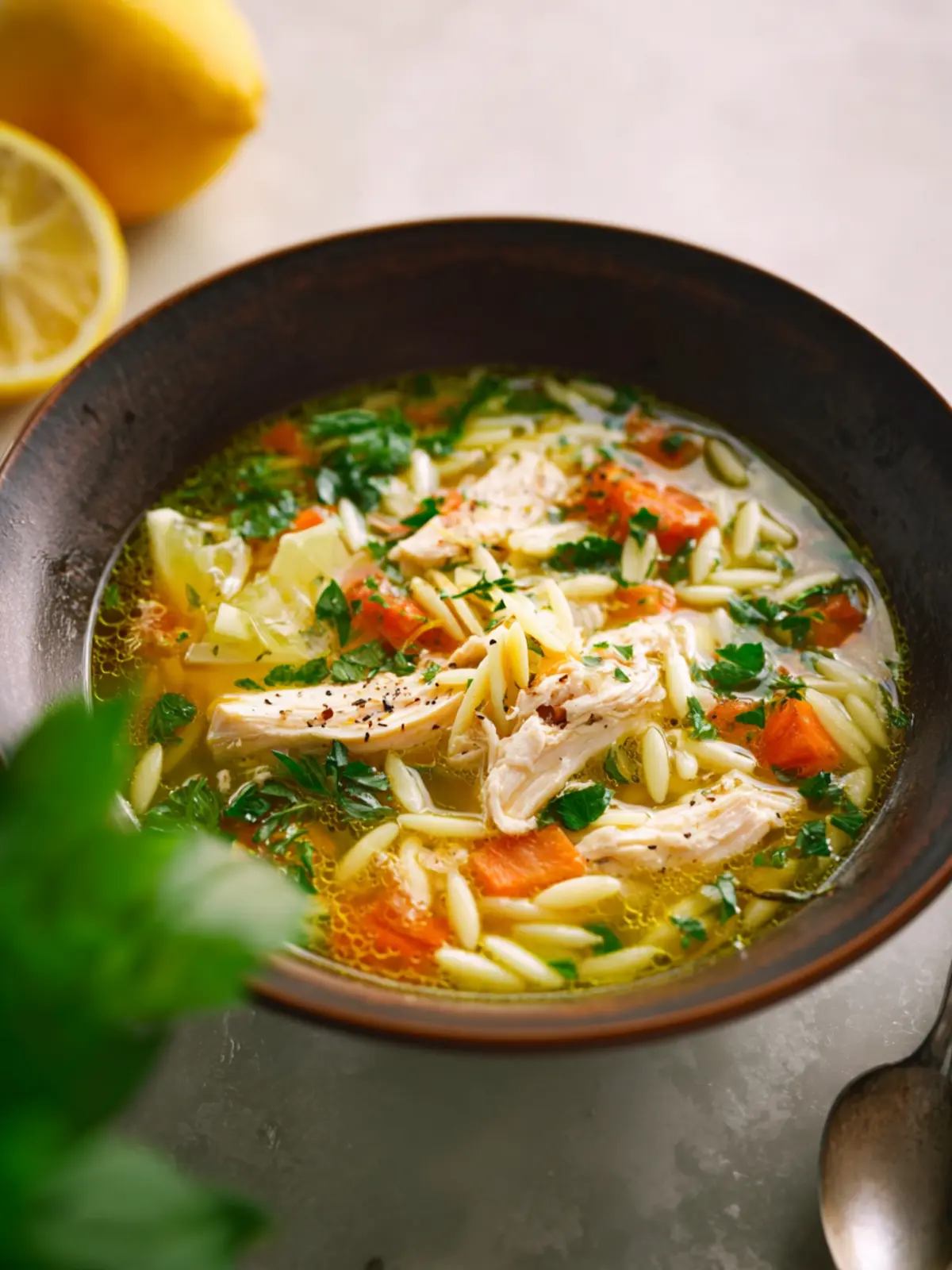 A comforting and flavorful lemon chicken orzo soup made with fresh ingredients.