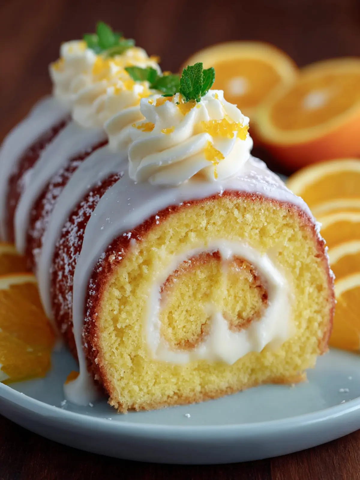 - Assemble the Cake: Unroll the cooled cake carefully. Spread the orange cream filling evenly over the surface. Roll the cake back up, without the towel, and place it seam-side down on a serving platter.