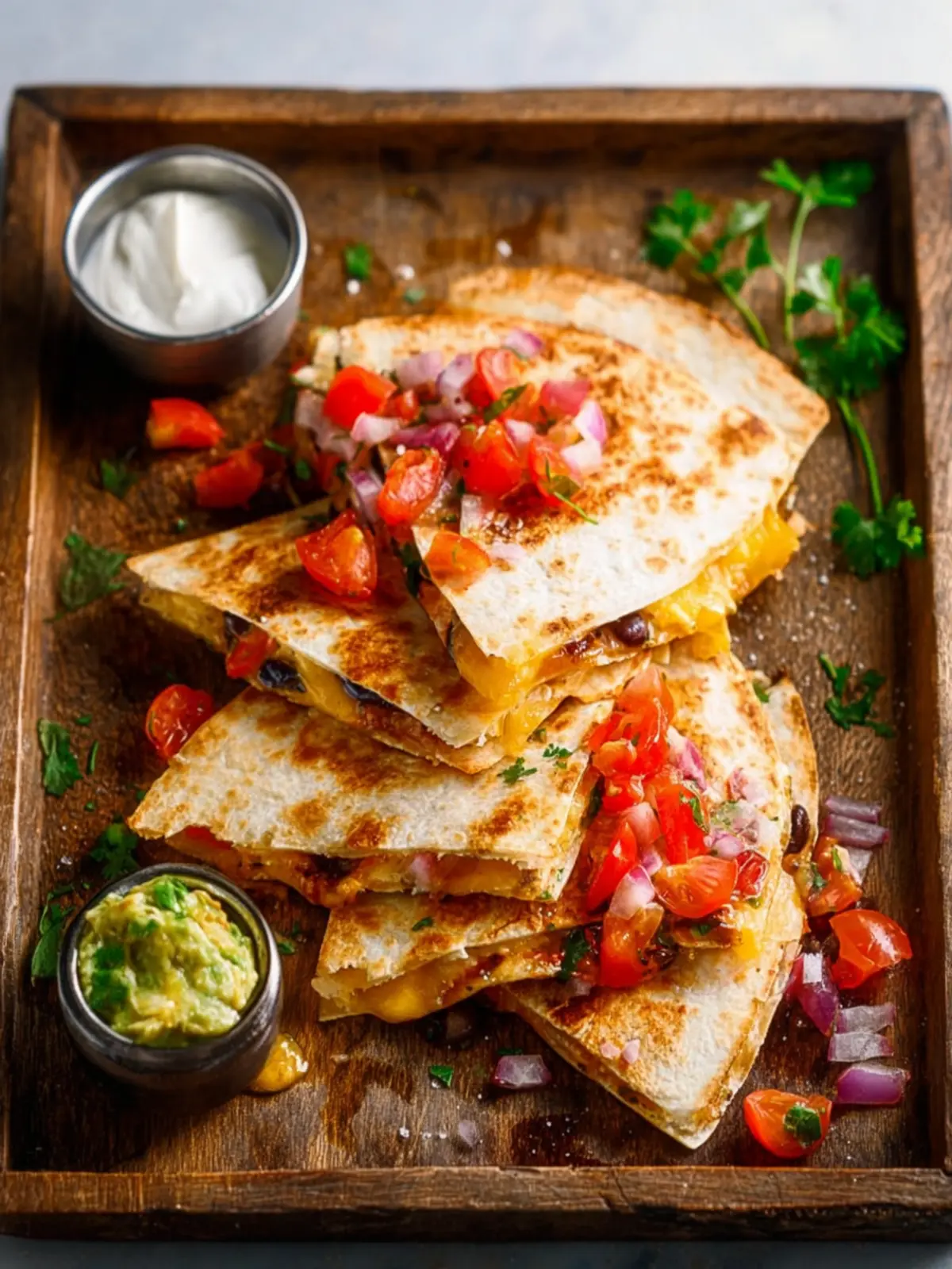 Delicious and crispy quesadillas filled with black beans, cheese, and fresh toppings.