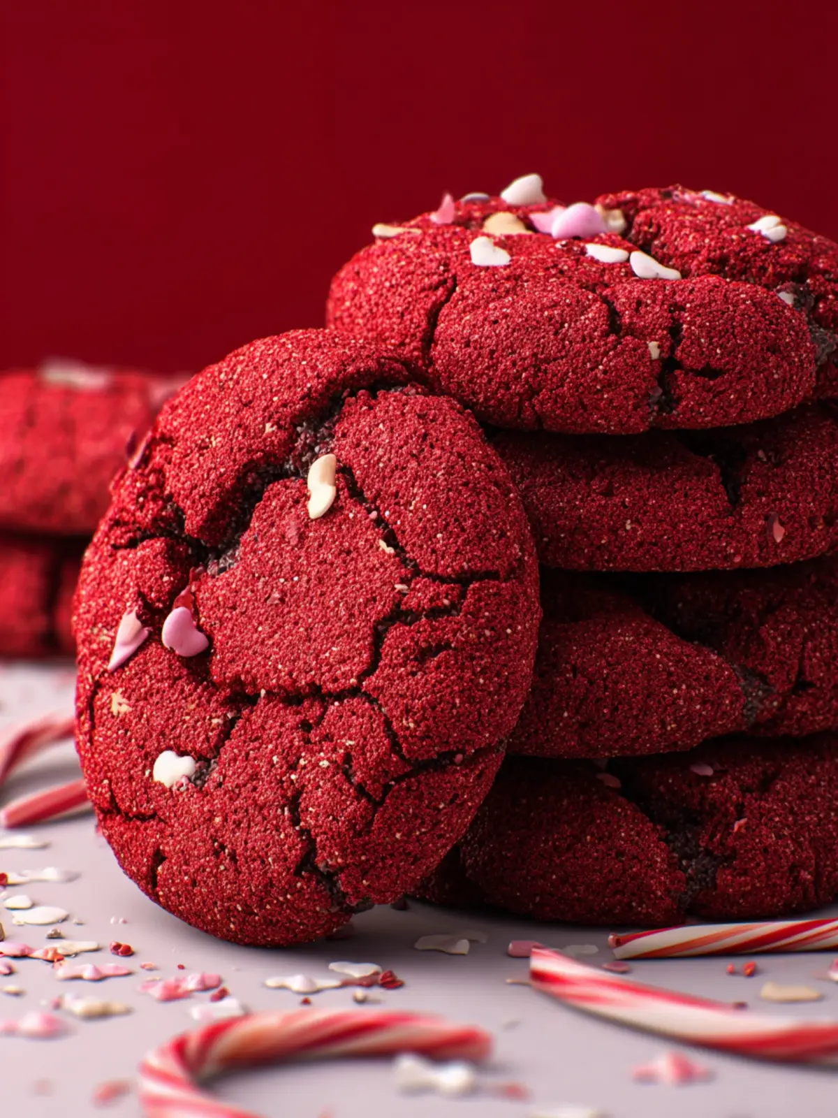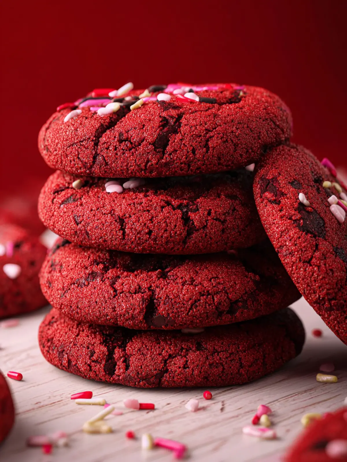 Delicious red velvet cookies with a mix of sprinkles and chocolate.
