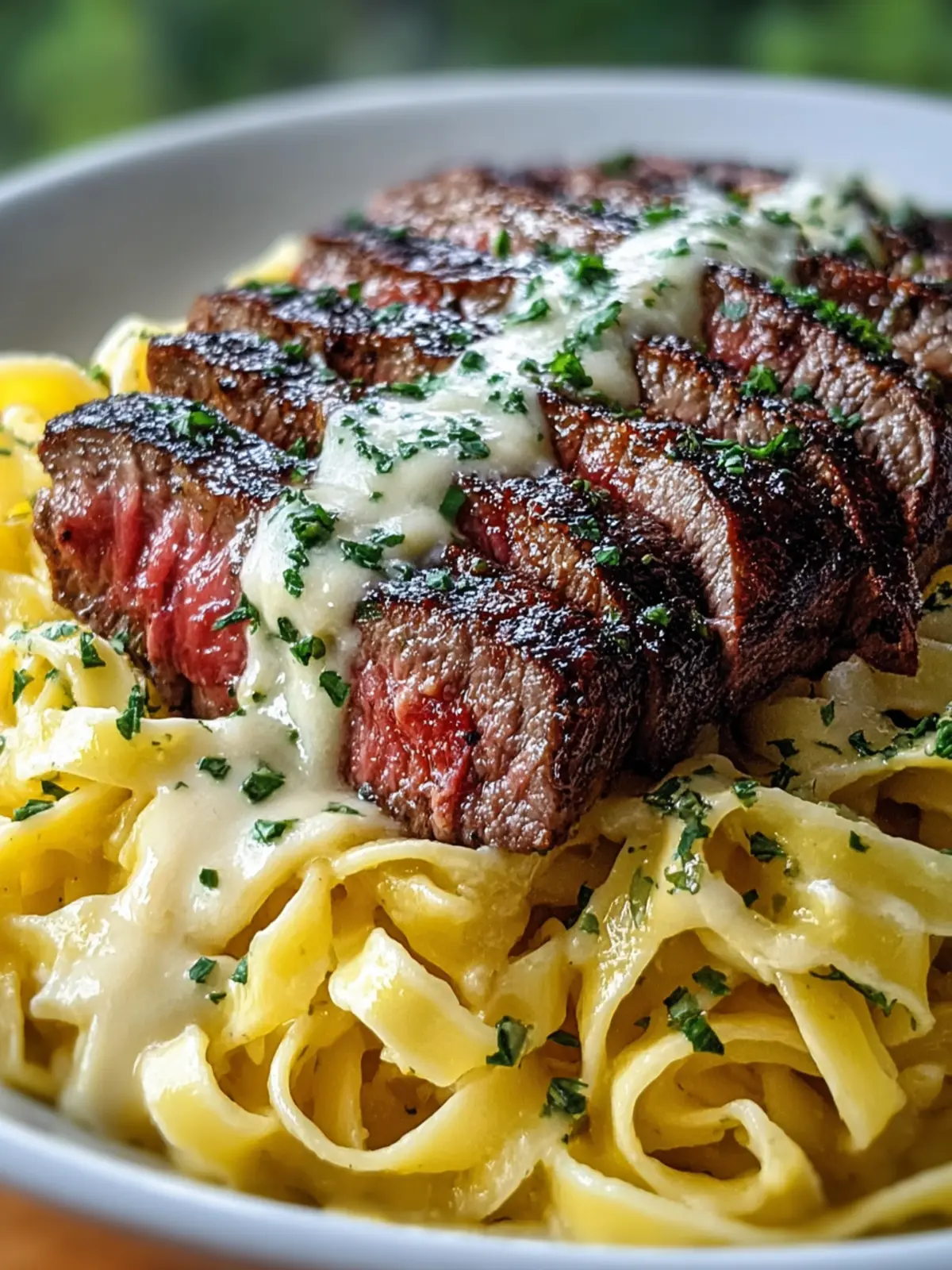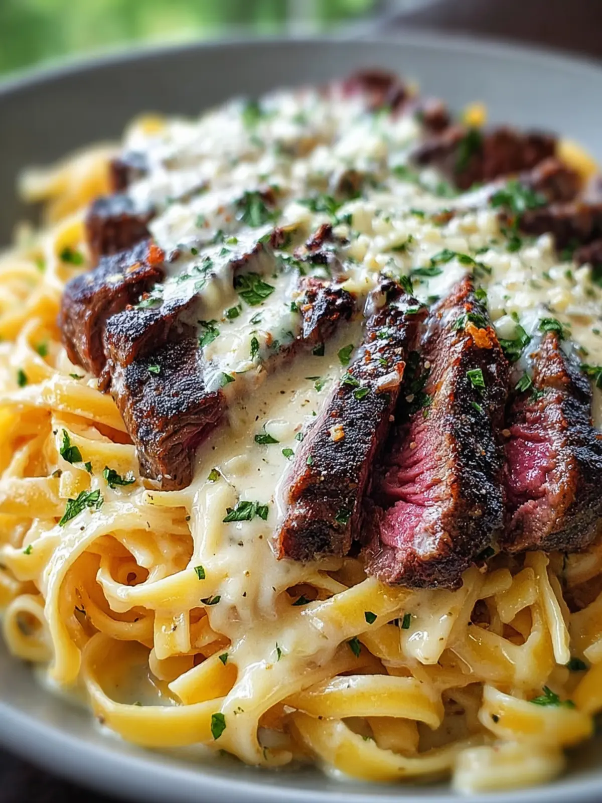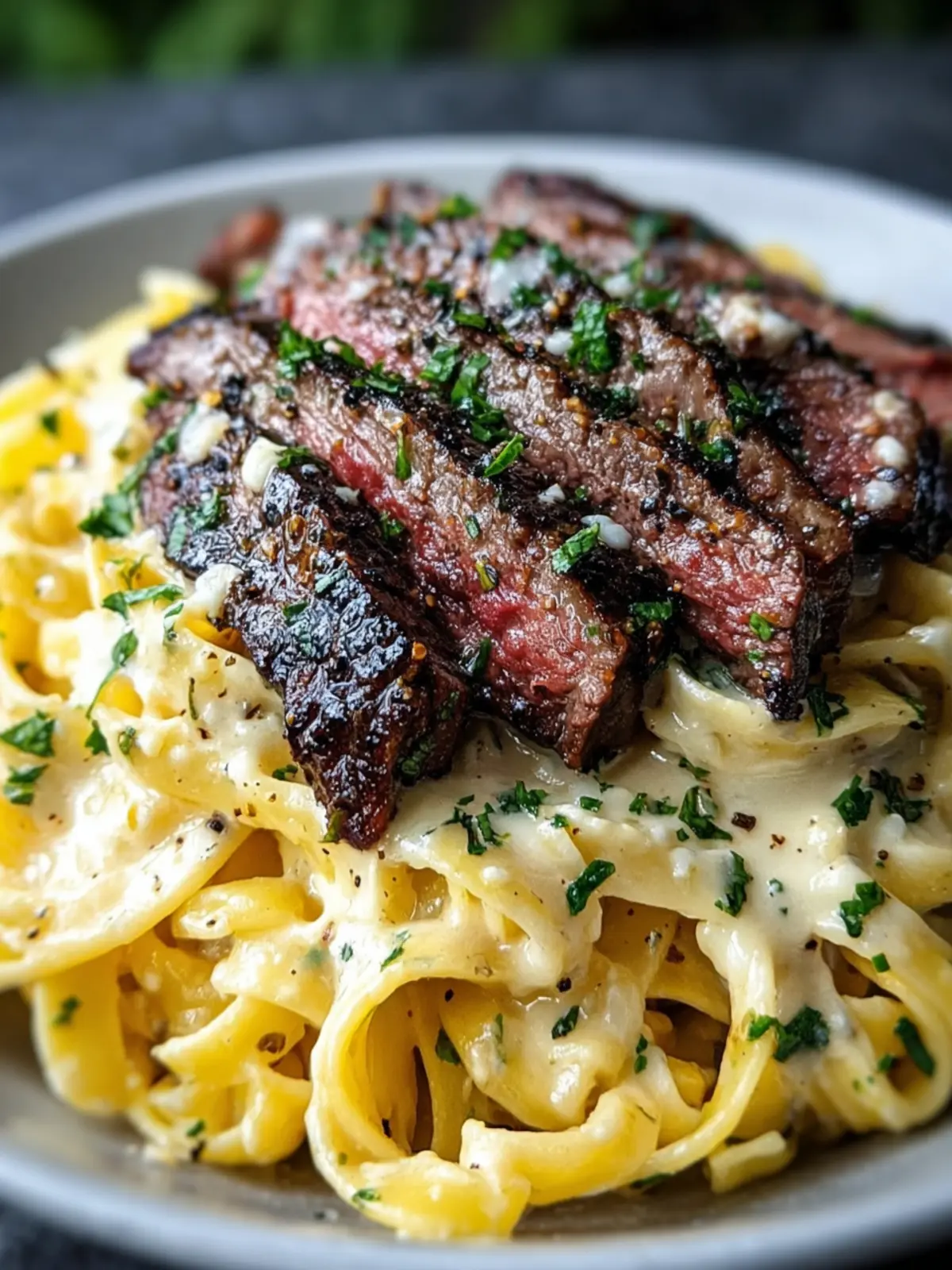 A delicious and creamy fettuccine Alfredo topped with perfectly seared steak.