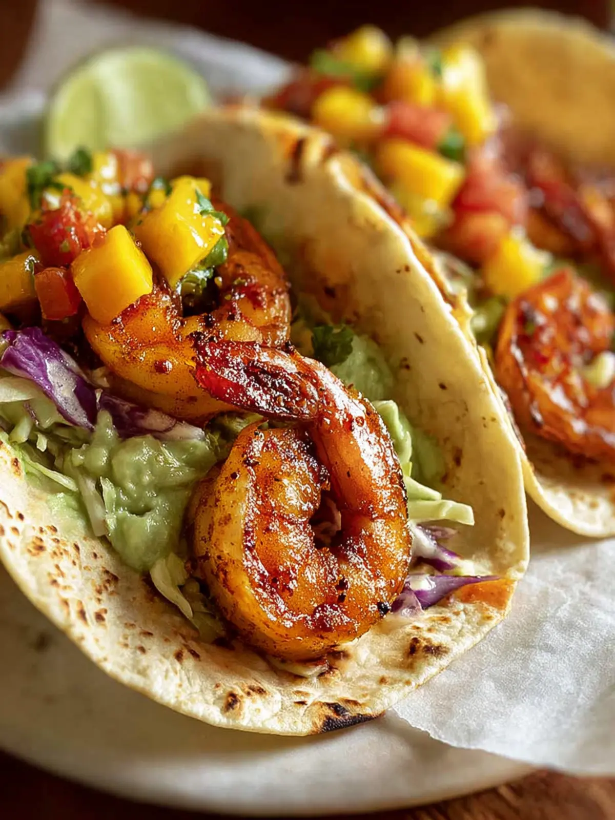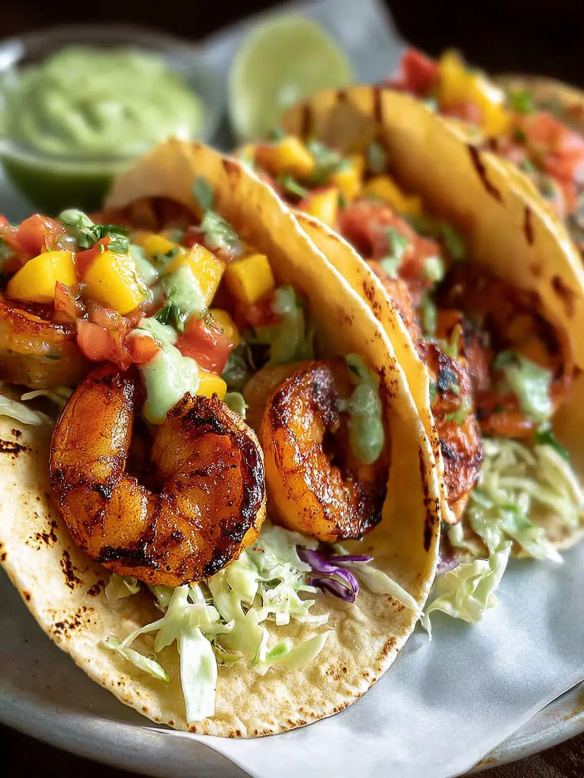 Shrimp Tacos with Avocado Crema: Juicy Slaw & Mango Magic!
