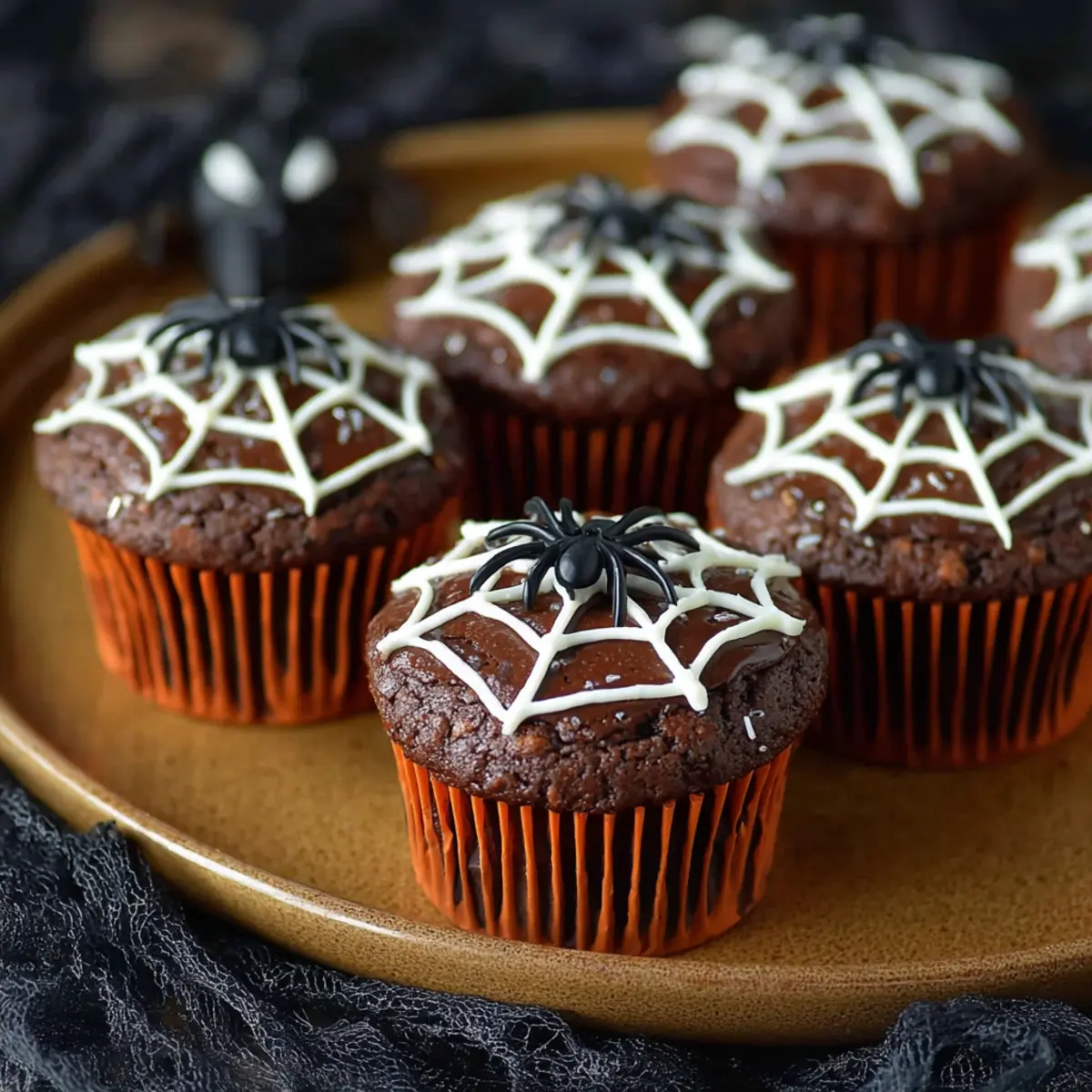 Delicious chocolate cupcakes decorated with a spooky spiderweb design, perfect for Halloween.