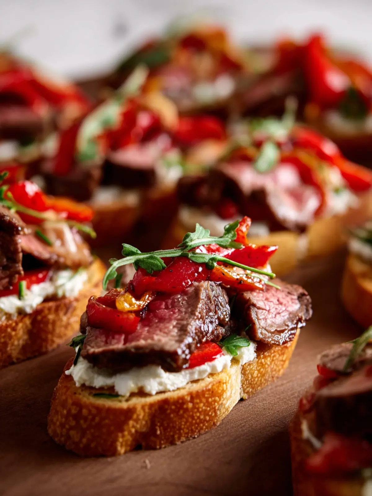 A delicious appetizer featuring tender steak, creamy goat cheese, and roasted red peppers, all on crispy baguette slices.