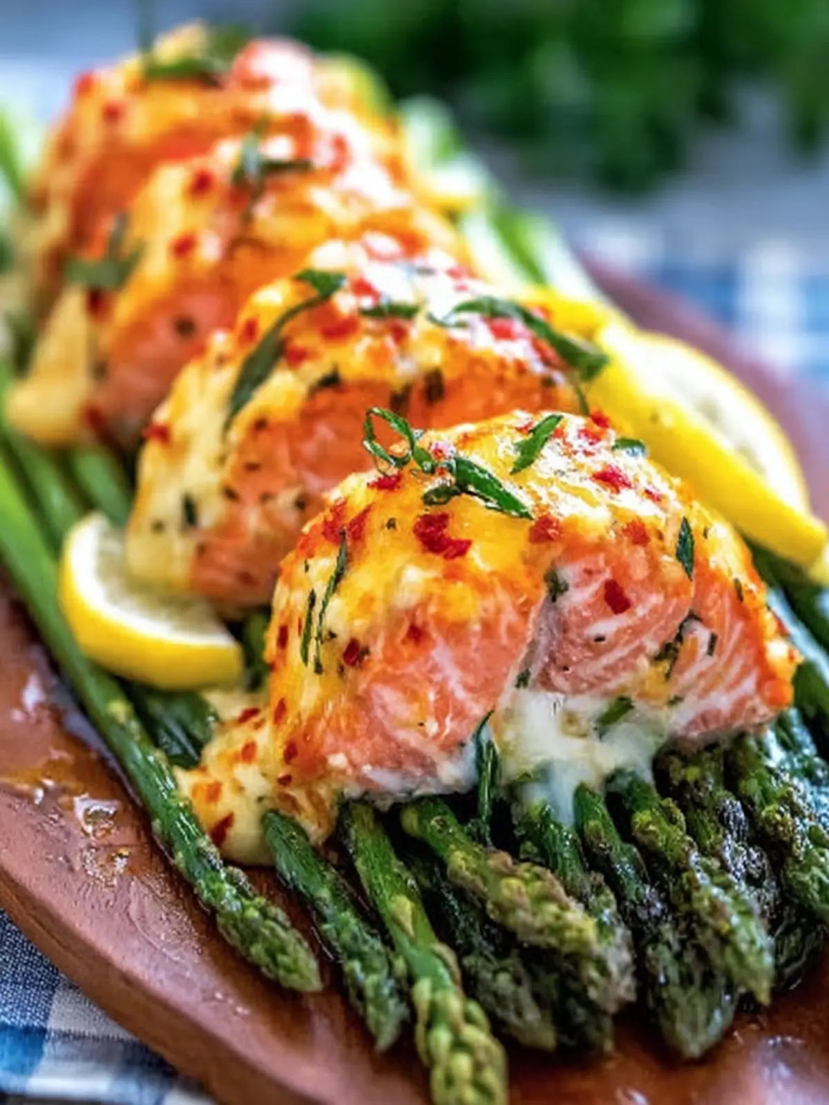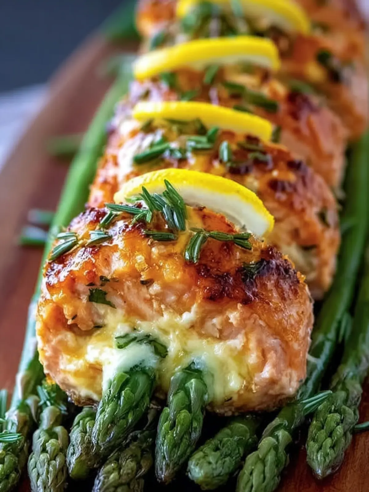 - Assemble: Place the stuffed salmon fillets on top of the asparagus.
