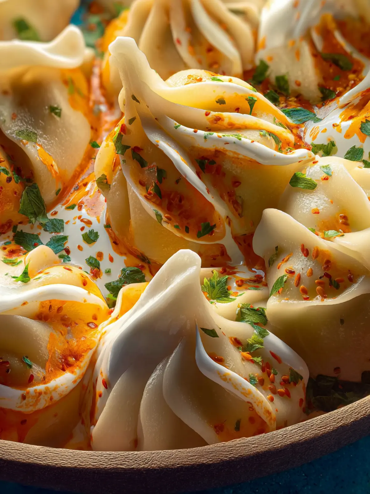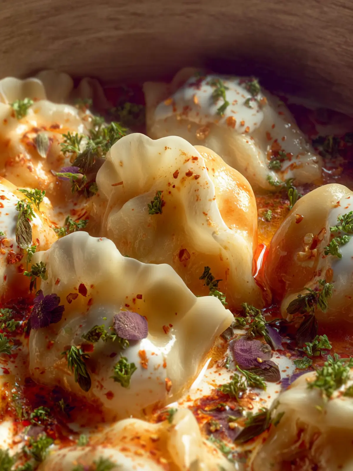 - Once cooked, take the dumplings off the heat and top with the yogurt sauce, brown paprika butter (or chili oil), and fresh dill. Repeat in batches of 7 until you have 21 dumplings in total. Enjoy!